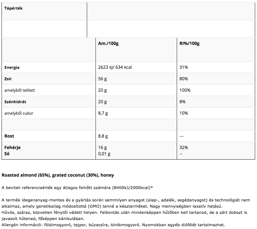 Egyedülálló mandula-kókusz kompozíció, mely kiváló minőségű mandulából, kókuszreszelékből és mézből készült. 100% természetes összetevők és nincs benne se hozzáadott só, se pálmaolaj.A mandulavaj szerepet játszik a koleszterin szint szabályozásában, E vitamint tartalmának köszönhetően ismert antioxidáns és gyulladásgátló hatása, valamint csökkenti az érelmeszesedést kockázatát. Alacsony glikémiás indexének köszönhetően megelőzi a hasnyálmirigy túlzott terhelését és a cukorbetegeknek is kedvező szénhidrát forrás. Lassítja a cukrok felszívódását az emésztőrendszerben és a fogyókúrázóknak is kedvez a cukrok zsírra való átalakulásának köszönhetően.