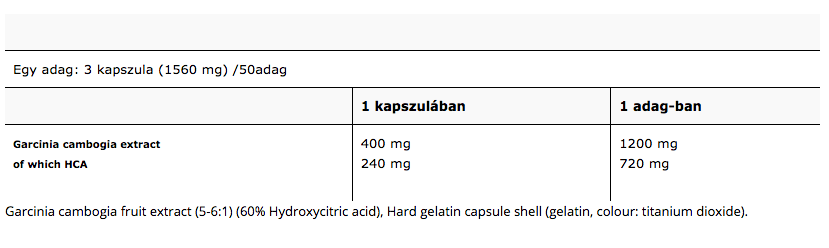 - 1200 mg Garcinia cambogia kivonat (ebből 720 mg HCA)